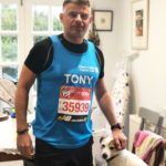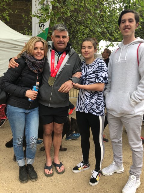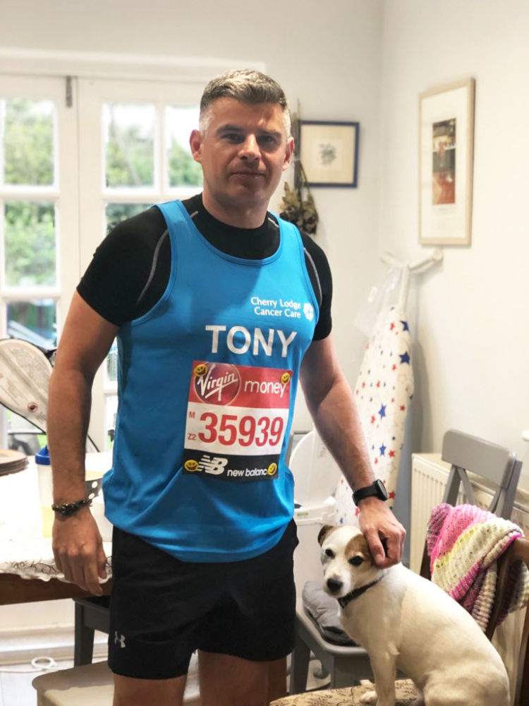 Tony put in the fastest time of all our Marathon runners this year – a very creditable 4hrs 6mins. When he set up his fundraising page at the end of last year he wrote: “Hi guys, I know I said I will never do another London Marathon again! However this time it’s different! As some of you may know my mother has been faced with the devastating news of terminal cancer and will have to face chemotherapy treatment for the rest of her life! Cherry Lodge Cancer Care in Barnet has been a safe haven for her in the past few months in more ways then one! I’m doing it for my mother and many like her, to help and support them in their battle!” Very sadly, Tony had to update his page two months later, with the news that his mother had lost her battle with cancer on 25th February but that she had died “peacefully surrounded by me, my wife and my daughter”. Our photos, below, show Tony before the race (with his dog who I am sure was glad not to have to take on the 26.2 miles) and after the race with family members.
