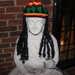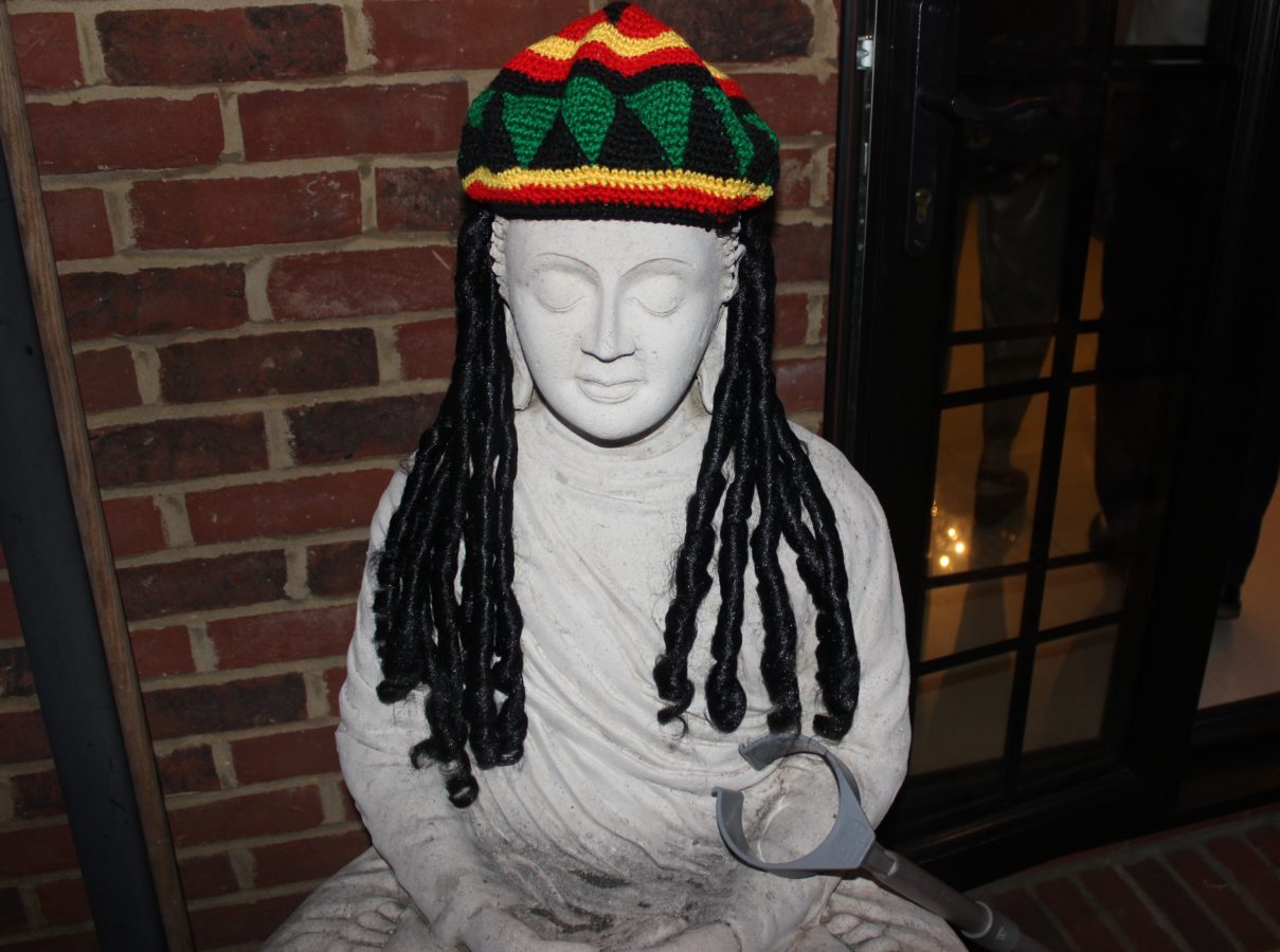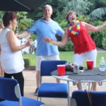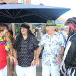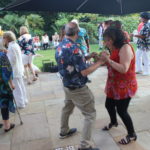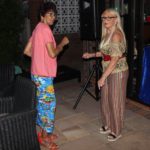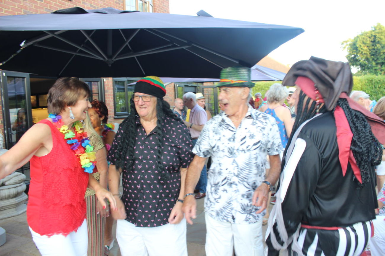 The setting was perfect – Myra and Norman’s beautiful home and garden on a lovely summer’s evening in the middle of a heatwave. Clothing choices reinforced the theme – lightweight ‘cruise wear’, bold patterns and bright colours. There was even a prize for the best costume – you might be able to pick out a a pirate from the Caribbean in one of the photos below. Notice too the garden statue’s special Jamaican headwear.