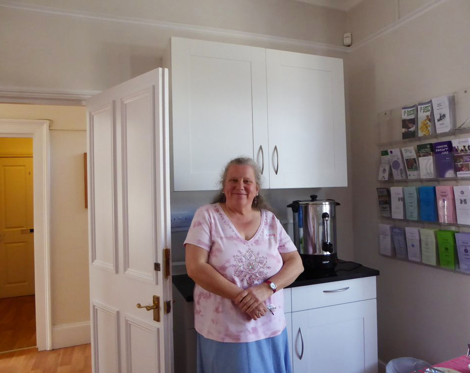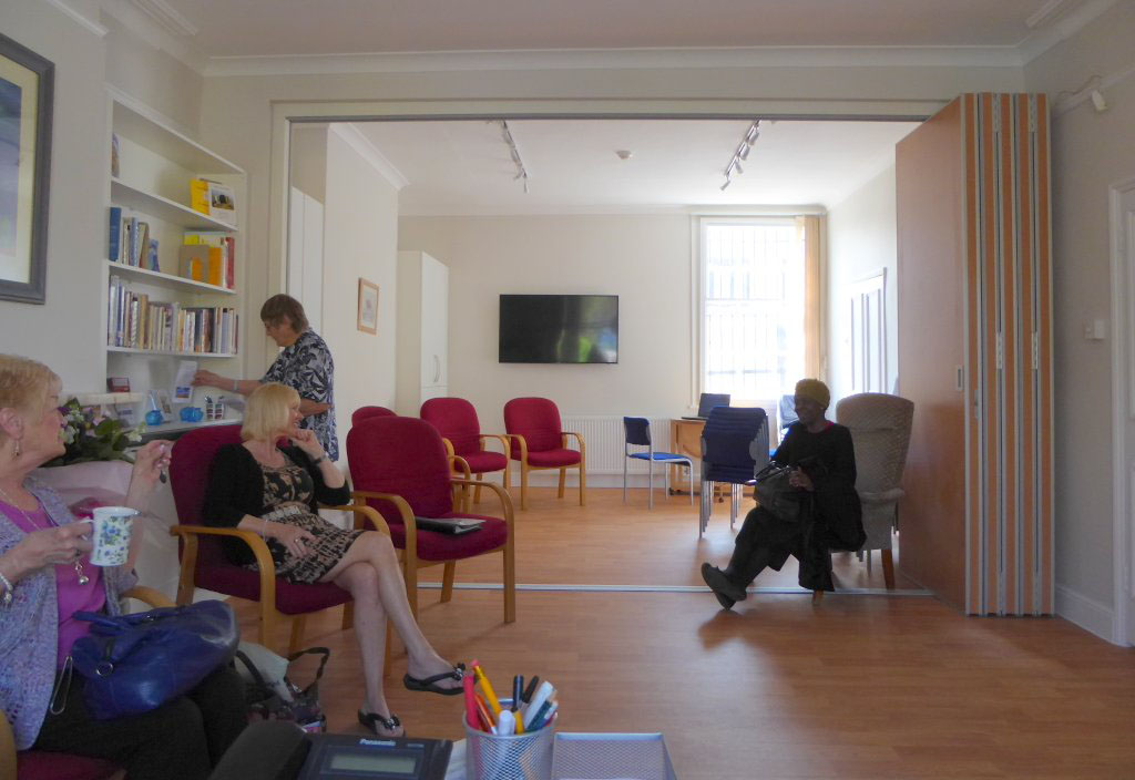 Inside the Centre, on the ground floor, there is a welcoming reception area manned by friendly and helpful volunteers. Wall racks are stacked with booklets and leaflets on cancer-related topics, mostly from Macmillan Cancer Support. To the rear is a meeting room, called the Andy Weekes Room, in Andy’s memory and in recognition of the stalwart fundraising efforts of Summer Soulstice. Connecting these two rooms are large, soundproof, folding doors (new in 2016), which can be opened to create a large space for meetings or hospitality.