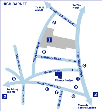 The nearest underground station is High Barnet on the Northern Line. The station, on a steep hill, is about half a mile from the Cherry Lodge Centre. To transfer to a bus, it is best to turn left as you leave the station, bear right by the car park, cross the main road at the pedestrian traffic light and then go right to the nearest bus stop.