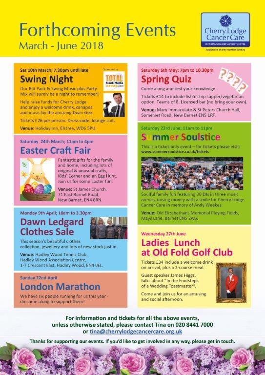 The fundraising team at Cherry Lodge Cancer Care is very pleased to give advance notice of the following events planned to take place between March and June 2018.