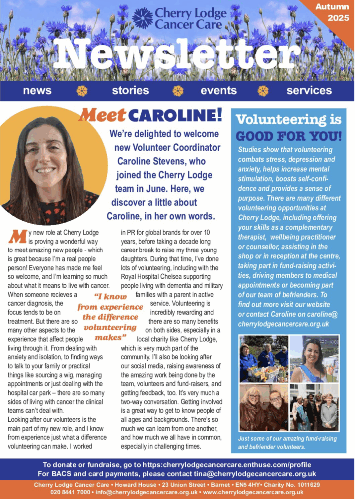 This issue leads with an invitation to ‘Meet Caroline’ Stevens, who joined the Cherry Lodge team in June 2025, taking on the important role of Volunteer Coordinator. Caroline describes herself as a real people person, who knows from experience the difference volunteering makes on both sides. Volunteering is good for you!