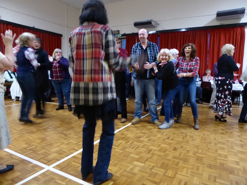 To at least one completely inexperienced barn dancer, the Caller’s language was completely new. ‘Forward turn, clap clap, backward turn, clap clap, take your partner by the hand. One gent, two ladies – decide who the ladies are! Switch partners, switch hands, switch feet.’ Then there were the geometrical instructions: ‘form a straight line, get into a square’ and so forth. All good fun. People, on the whole, followed the instructions to the letter and no accidents were observed.