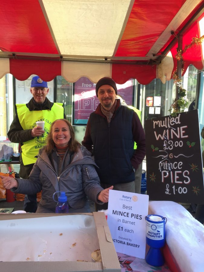 Numerous charities, including the Wood Green Animal Shelter and St John Ambulance, had stalls to inform the public about their function. Other stallholders concentrated on providing refreshments. Among the people selling mince pies and mulled wine on the Barnet Rotary Club stall (see photo 5, below) was Dan Orchard, Cherry Lodge’s webmaster. Had it not been quite so early in the day, it might have made sense for our reporter to buy a glass and keep out the cold – but temptations are there to be resisted!