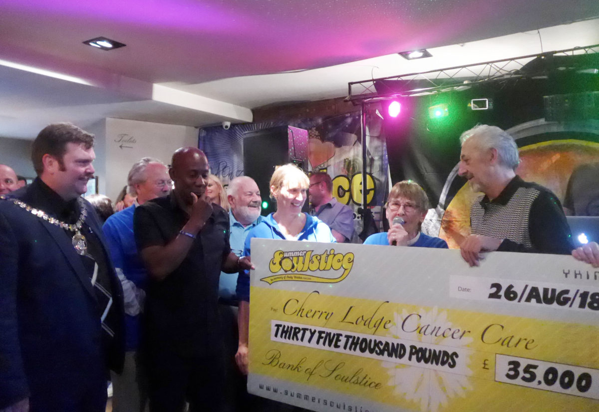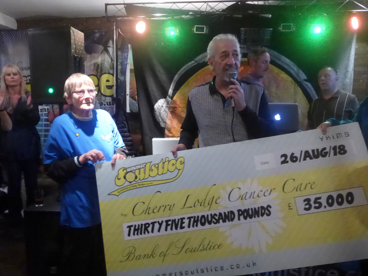 The customary handing over of a big cheque from Summer Soulstice to Cherry Lodge Cancer Care took place on Bank Holiday Sunday, 26th August 2018 during the Big Payback soul music event at the Black Horse pub in Barnet.
