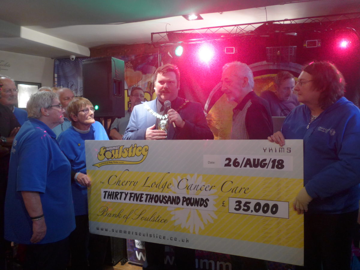 As a result, on Big Payback Day 2018, Summer Soulstice were in a position to give Cherry Lodge a big cheque for £35,000, an amount that was totally unimaginable two months ago after the burglary had taken place. In the presence of the Mayor of Barnet, Councillor Reuben Thompstone, accompanied by the Mayoress and a very large gathering of Soulstice and Cherry Lodge supporters, the cheque was formally presented by Dave James, Chairman of Summer Soulstice, to Dr Margaret Clark, Chairman of the Trustees of Cherry Lodge Cancer Care.