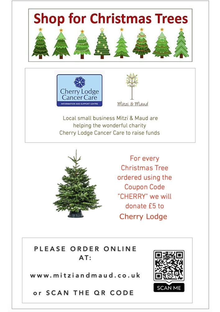 By buying your Christmas tree from Mitzi and Maud, you can help raise money for Cherry Lodge. This local business will donate £5 to Cherry Lodge for every tree bought using the coupon code CHERRY.