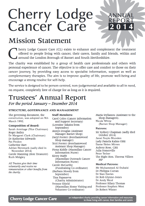 Cherry Lodge Cancer Care held its 2015 Annual General Meeting at Howard House on Tuesday 12th May. The meeting was attended by a cross section of interested parties: members, volunteers, staff, trustees and patrons. Dr Margaret Clark, chairman of the trustees, began with a few words of welcome, which were followed by formal approval of the minutes of the 2014 AGM.