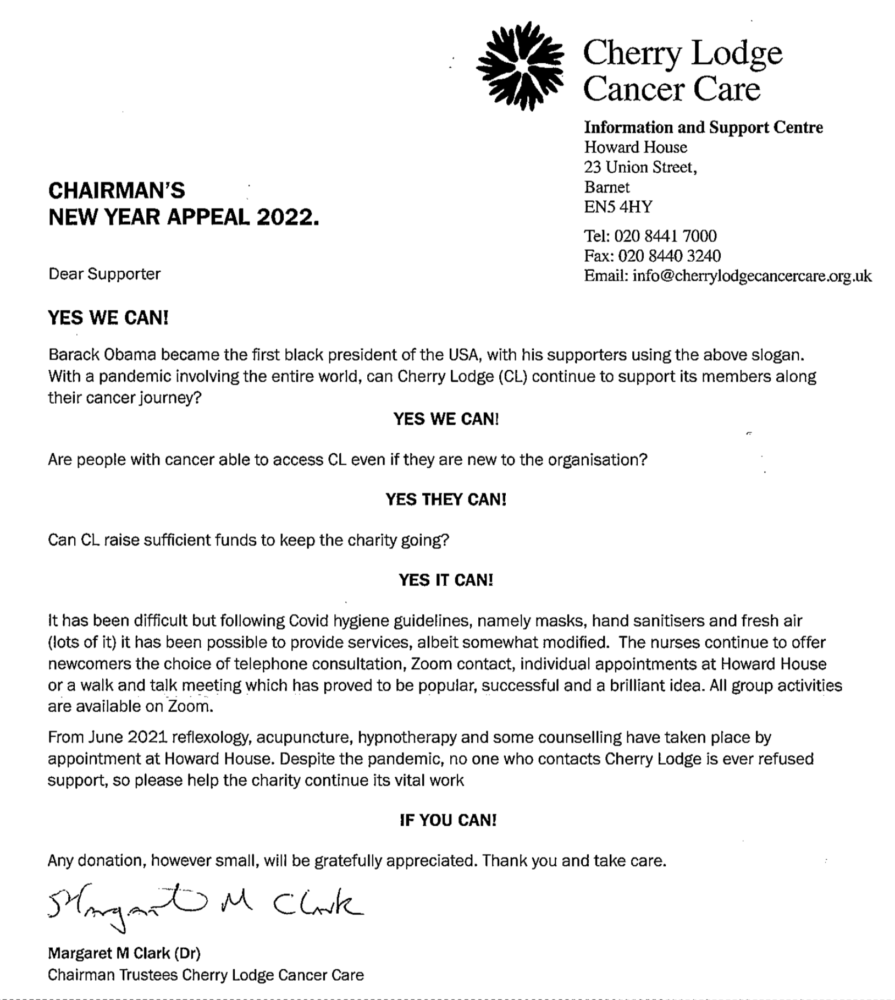 To make a donation, please either print off and use the slip at the foot of the Appeal letter, or find information on the How to Donate page of this website, or contact Tina (CL Fundraising Coordinator) by phone on 020 8441 7000 or by emailing tina@cherrylodgecancercare.org.uk.