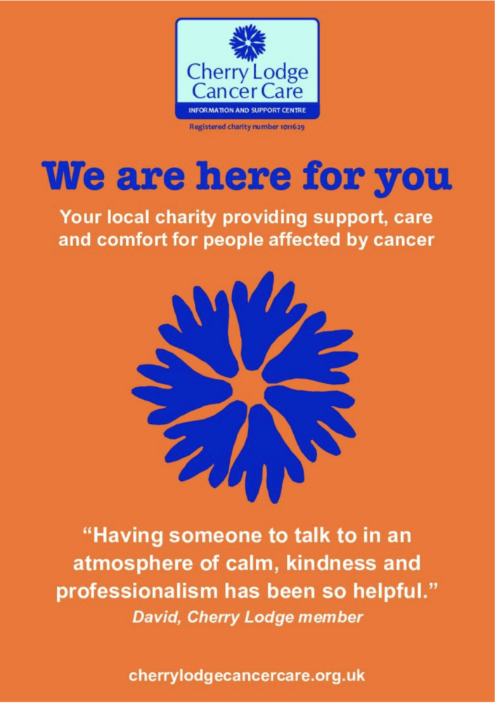 Cherry Lodge Cancer Care is pleased to announce that we have received delivery of our bright new leaflet. Thank you to everyone who helped produce it. Copies are already available at Howard House and will be distributed more widely soon.