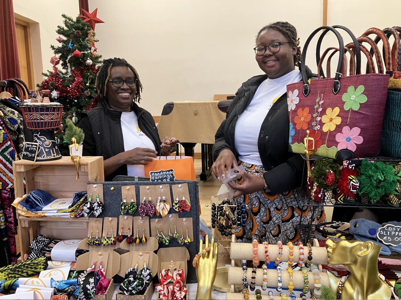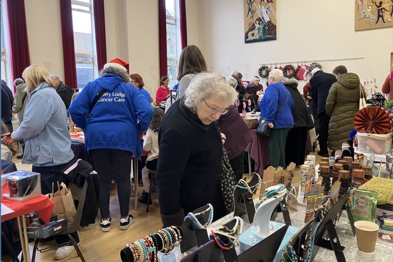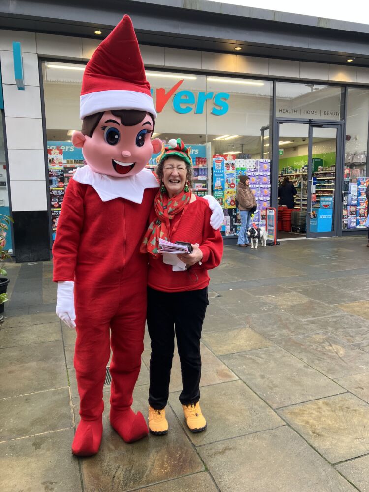 The keenly anticipated Cherry Lodge Cancer Care 2024 Christmas Fair took place on Saturday 30th November. The venue – a new one for this popular event – was Wesley Hall, in Stapylton Road, High Barnet. A banner outside the Cherry Lodge centre, sponsored by Kütchenhaus Cockfosters, Colossians Cleaning Services, and Atherton York helped publicise the event. So too did our very friendly Christmas Elf, accompanied by Renie, who greeted shoppers in The Spires.