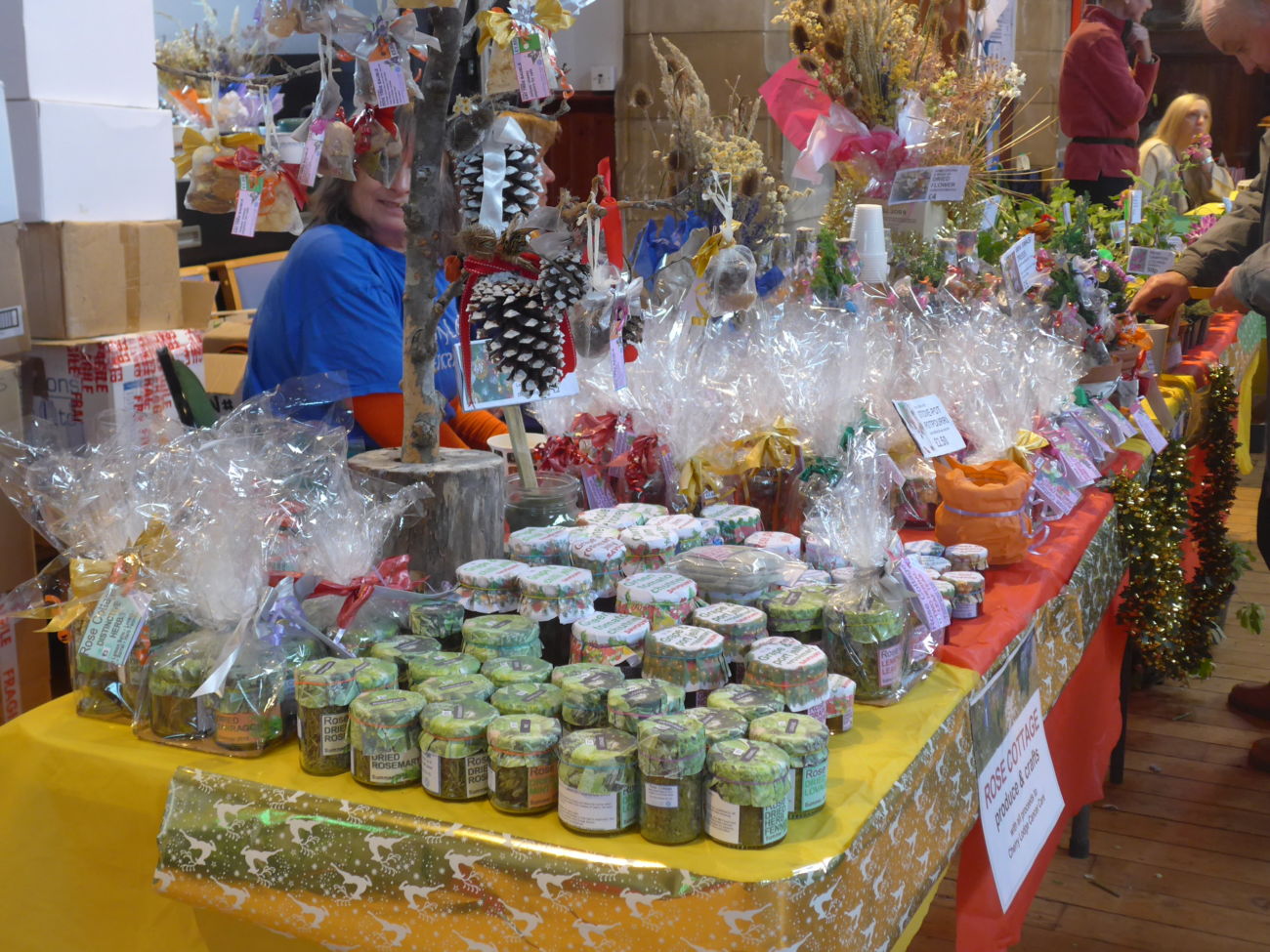 The Market was opened at 11am by the lovely singing on stage of a group of chidren from Cromer school. Many thanks to all of them – and to the many parents who came along to listen to their youngsters and do some Christmas shopping. The many stalls offered a great selection of lovely and unusual gifts, Christmas tree decorations, furry toys, plants, dried herbs, soaps, etc. There was also some delicious local honey to taste and buy. Locally made relishes and preserves disappeared very quickly on account of their well established excellent reputation – thank you Sheila and Garth.