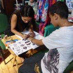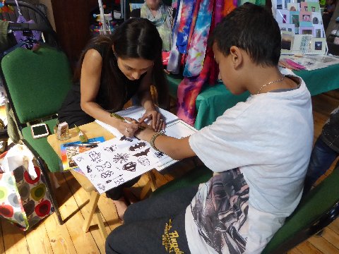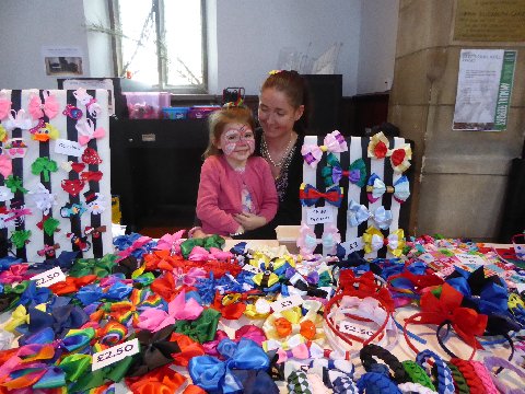 The weather, with wall-to-wall sunshine, certainly helped make this a most enjoyable and cheerful event with Bugs Bunny standing outside and encouraging people to come to the Fair. The well-stocked stalls were varied and colourful and created a festive atmosphere. One busy stall specialised in the latest hair fashion for young girls (see photo 2, below) while the sand art stall became a very popular focal point. Particular efforts had been made to attract and amuse more boys and girls and this certainly paid off. There was an egg painting stall (photo 4), an egg hunt and a guess how hany eggs in the bowl, all of which proved a great success and had the children energetically running about. Face painting was as popular as ever and, for the first time, there was a henna artist (photo 6).