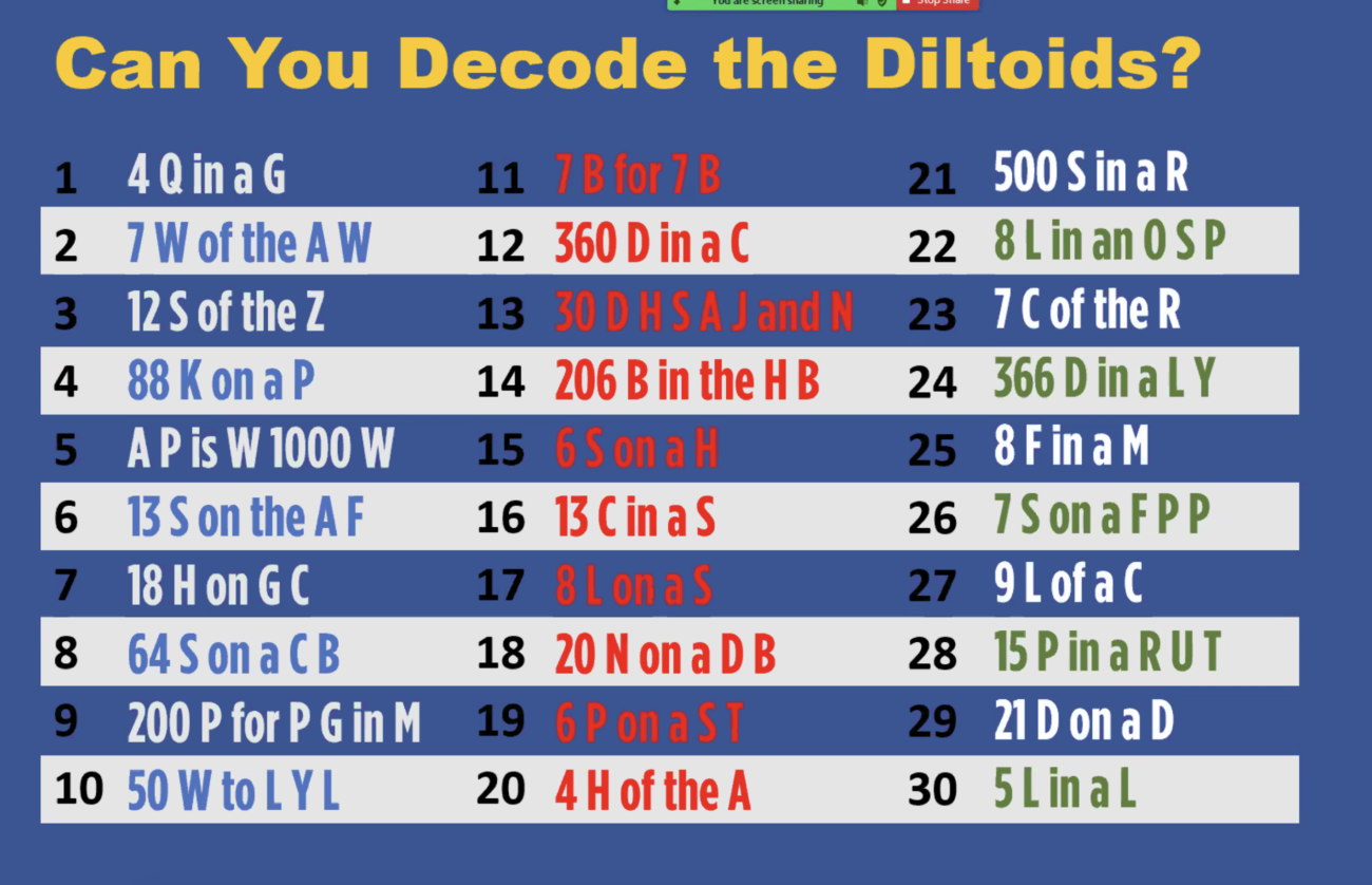 Everything went smoothly from beginning to end, with the same format as CL’s previous Zoom quiz, held on 7th February 2021 and the Conundrum-21 quizzes, hosted by Jem on Saturday evenings in support of NHS charities. There were six well chosen rounds, all including a clever range of questions designed to test different areas of knowledge.