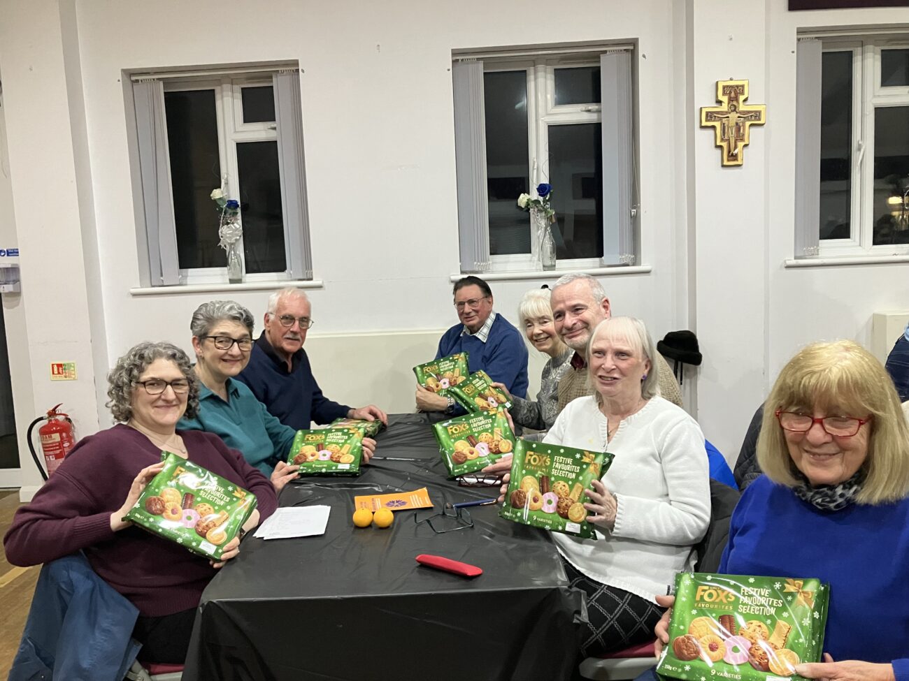 As always team fortunes were mixed, with final totals for the nine tables ranging from a magnificent high of 137 (table 9), followed by 130 (table 2), down to lows of 106 (tables 7 and 8) and 103 (table 3). As is customary at CL quizzes, the winners won something good to eat (in this case Fox’s Festive Favourites) while those who finished last received toilet rolls. There were also raffle prizes to be won, including a spendid basket of fruit.