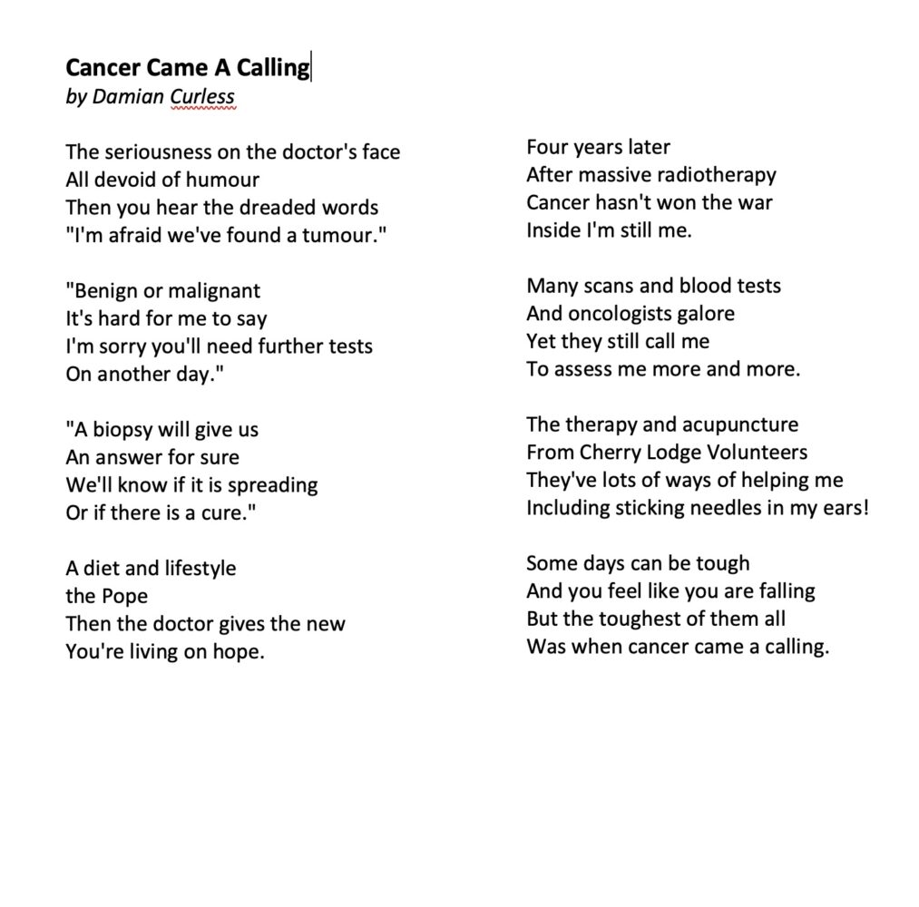 This year there were five poem readers, representing different groups within the CL family. First to read was CL member Rose W, with a touching poem entitled “Remember Me”. She was followed by Neville R, who read the very moving “Do not stand by my Grave and Weep” in memory of his recently deceased wife Alison, a CL member. Next up was Ruth M, CL trustee and website editor, reading two more (thankfully different) very short poems also entitled “Remember Me”. Tina’s choice was a meditative poem on the theme of “Every Sunset” by Xy-sa Rhea. The final poem, later in the programme, was written and read by CL member Damian C. Entitled “Cancer Came a Calling”, this poem is an engaging description of Damian’s own cancer journey (its words can be read in the gallery below).