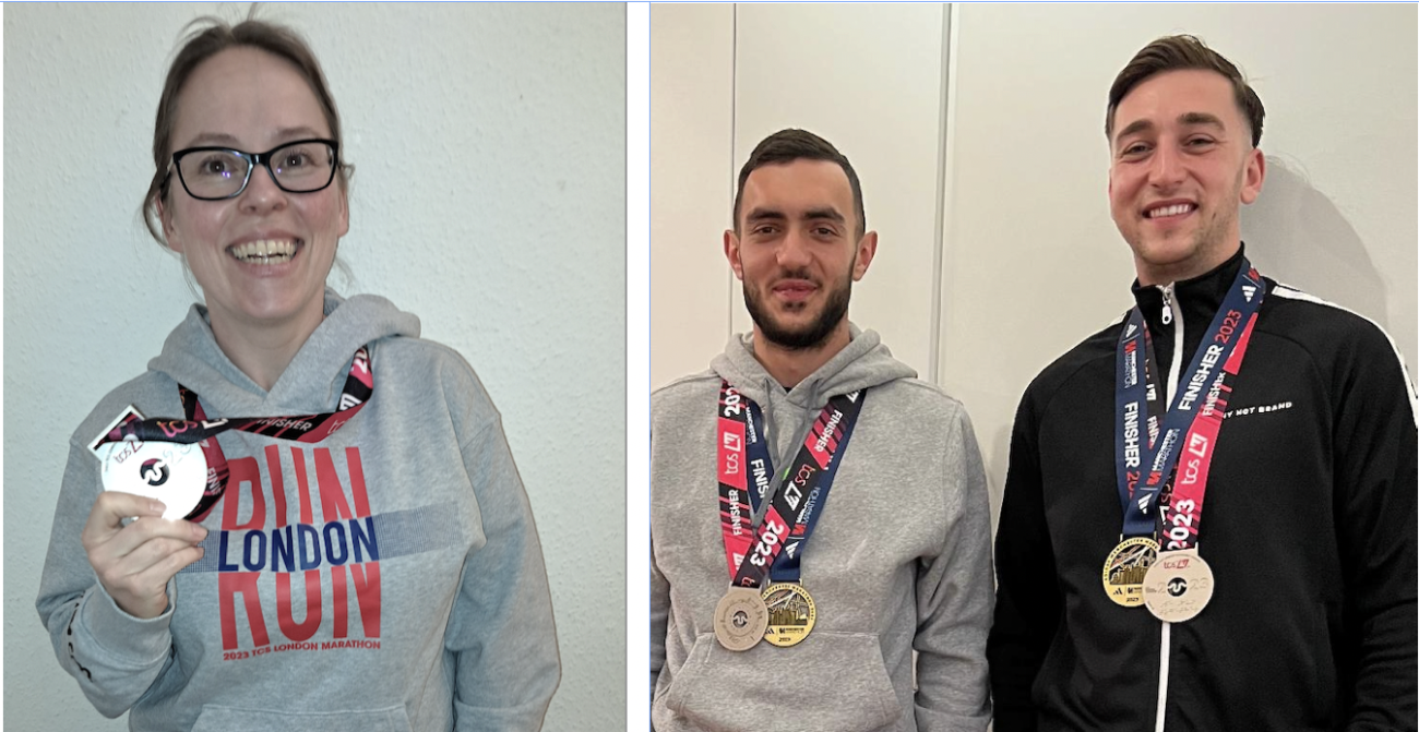 Photographs of Maja and Vass (left) and Sam, wearing their Marathon medals, were taken at the Cherry Lodge Centre at the small reception on Monday 24th April 2023.