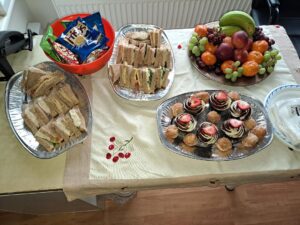 Our runners were praised for taking part in such a gruelling event and thanked for choosing to raise money for Cherry Lodge, when they could equally well have chosen dozens of other worthy charities. During their visit, the three were treated to a massage to soothe their aching limbs. Thank you to CL therapists Andi and Loretta for coming in to do this. Refreshments were also on offer – an inviting platter of sandwiches, cakes and lots of fruit. Thank you also to Tina for making the arrangements.