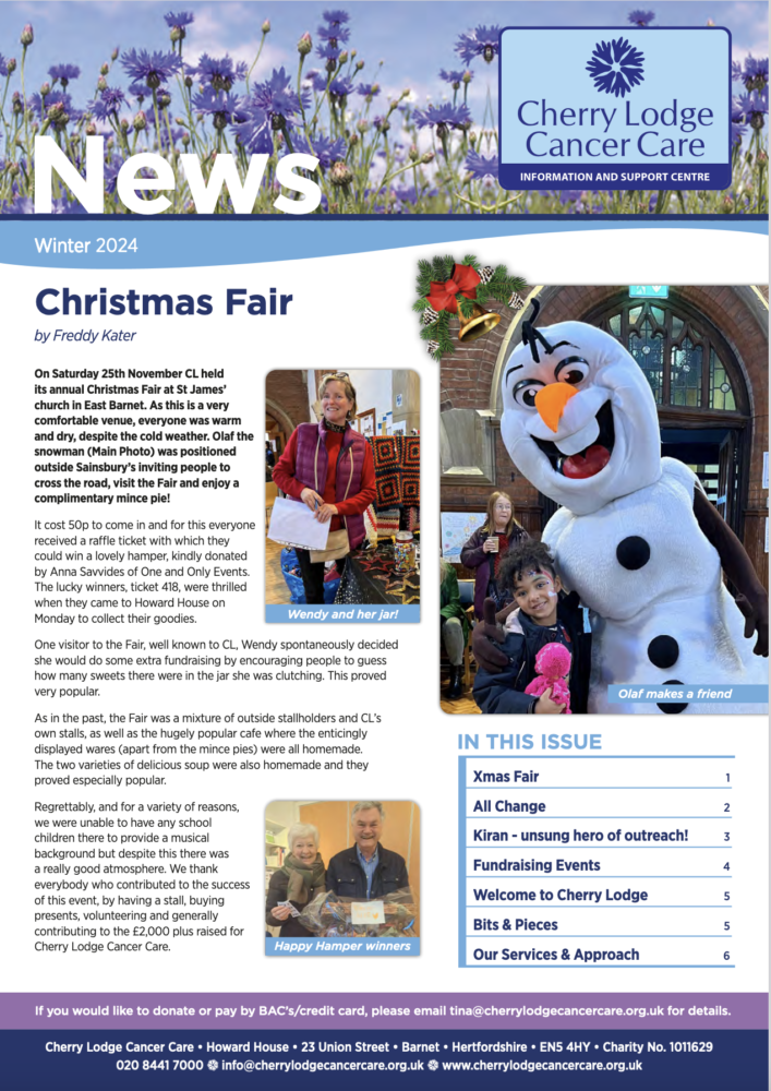 The Winter 2024 issue of ‘Cherry Lodge News’ has recently been sent to everyone on the Cherry Lodge Cancer Care mailing list. It is also possible, via this website, to download a pdf of the newsletter to read onscreen or to print out. Note that if you no longer wish to receive a copy of the newsletter by post, you can unsubscribe by contacting Tina by phone on 020 8441 7000 or email tina@cherrylodgecancercare.org.uk
