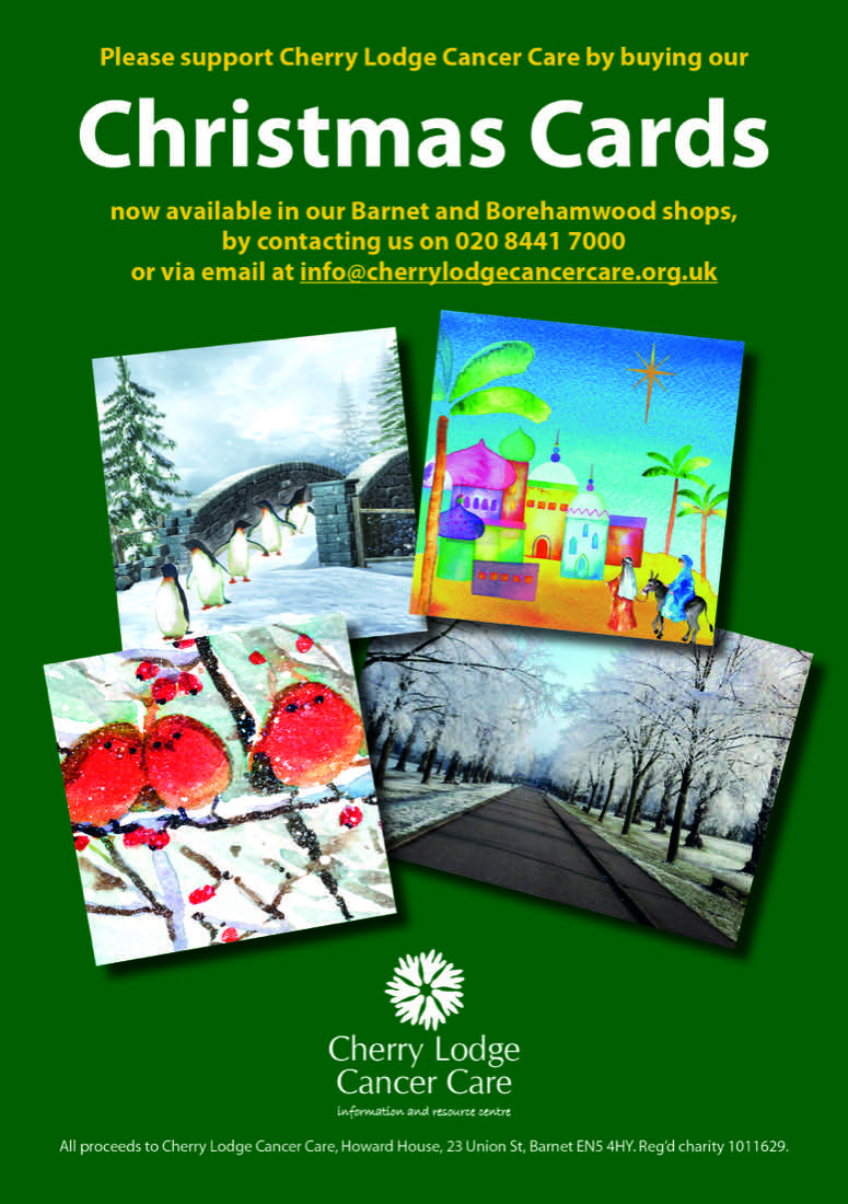Christmas cards are now on sale in our Barnet and Borehamwood shops and at the Cherry Lodge centre. To place an order for cards, please call 020 8441 7000 or email info@cherrylodgecancercare.org.uk.