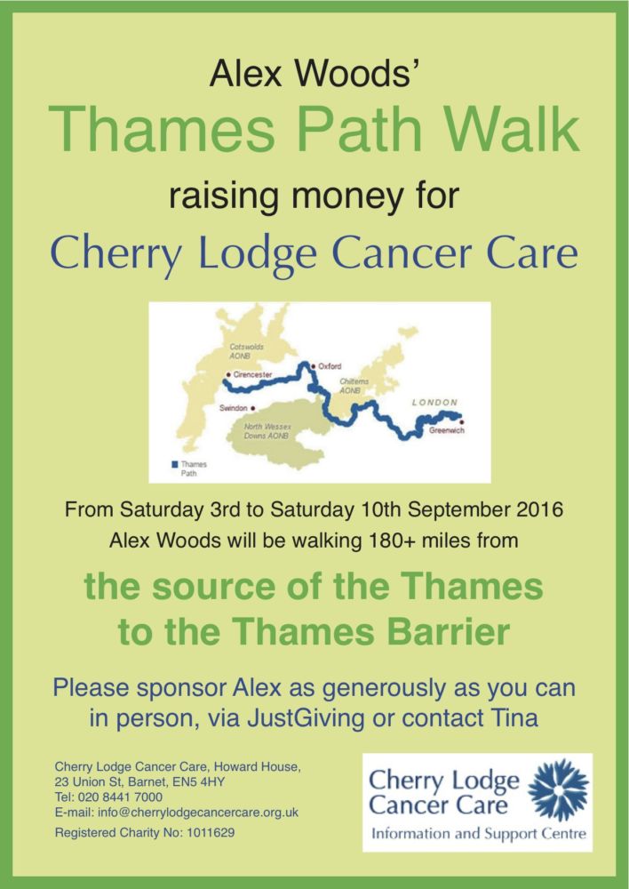 From 3rd to 10th September 2016, Alex Woods will be walking the Thames Path to raise money for Cherry Lodge Cancer Care. He will be covering between 20 and 26 miles each day – a total of 184 miles – from the source of the Thames in Gloucestershire to the Thames Barrier. This is an ambitious challenge and is Alex’s way of saying thank you to Cherry Lodge for the support received during the illness of his wife, Anne Marie.