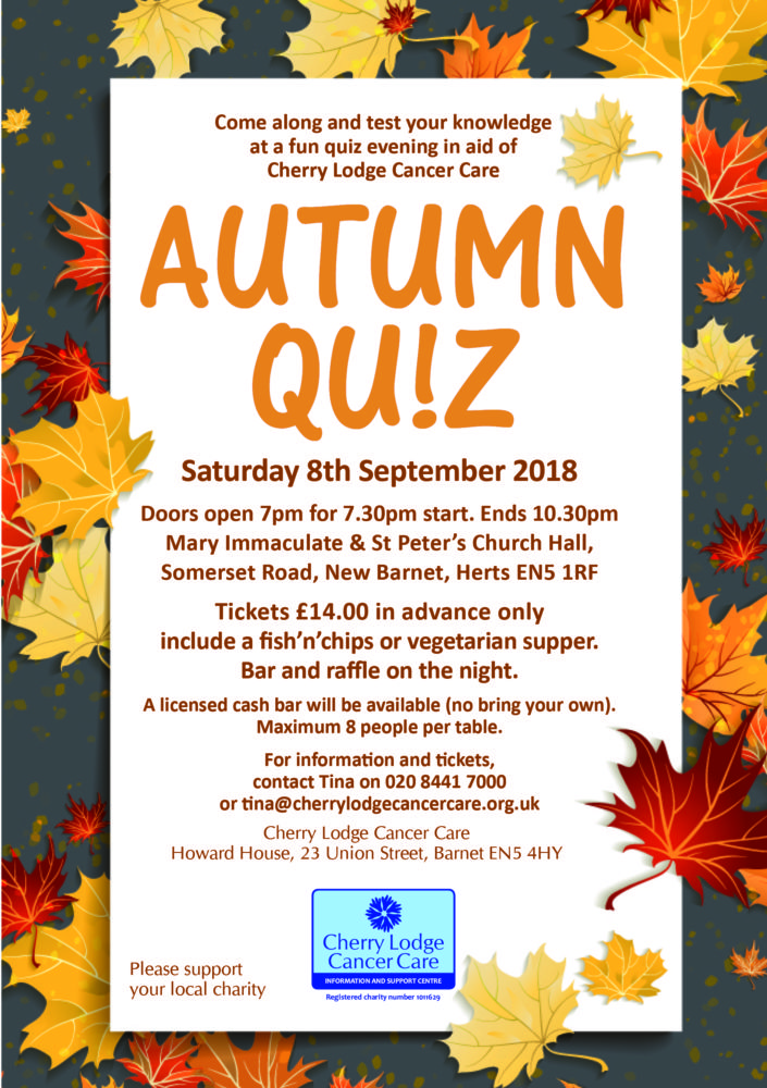 This Autumn Quiz night presents a great opportunity to have fun with friends, answer (or attempt to answer) a range of interesting questions, enjoy a fish ‘n’ chips or vegetarian supper – and raise money to help fund Cherry Lodge’s much needed cancer information and support services. For information and tickets, please contact Tina on 020 8441 7000 or email Tina@cherrylodgecancercare.org.uk.