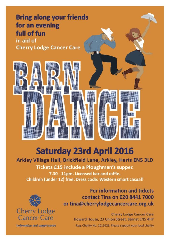 Grab your friends and come along to Arkley Village Hall on Saturday 23rd April 2016 for an evening of fun and dancing. Proceeds are in aid of Cherry Lodge Cancer Care, so as well as having a great time you will be helping raise funds for Cherry Lodge’s much needed information and support services.