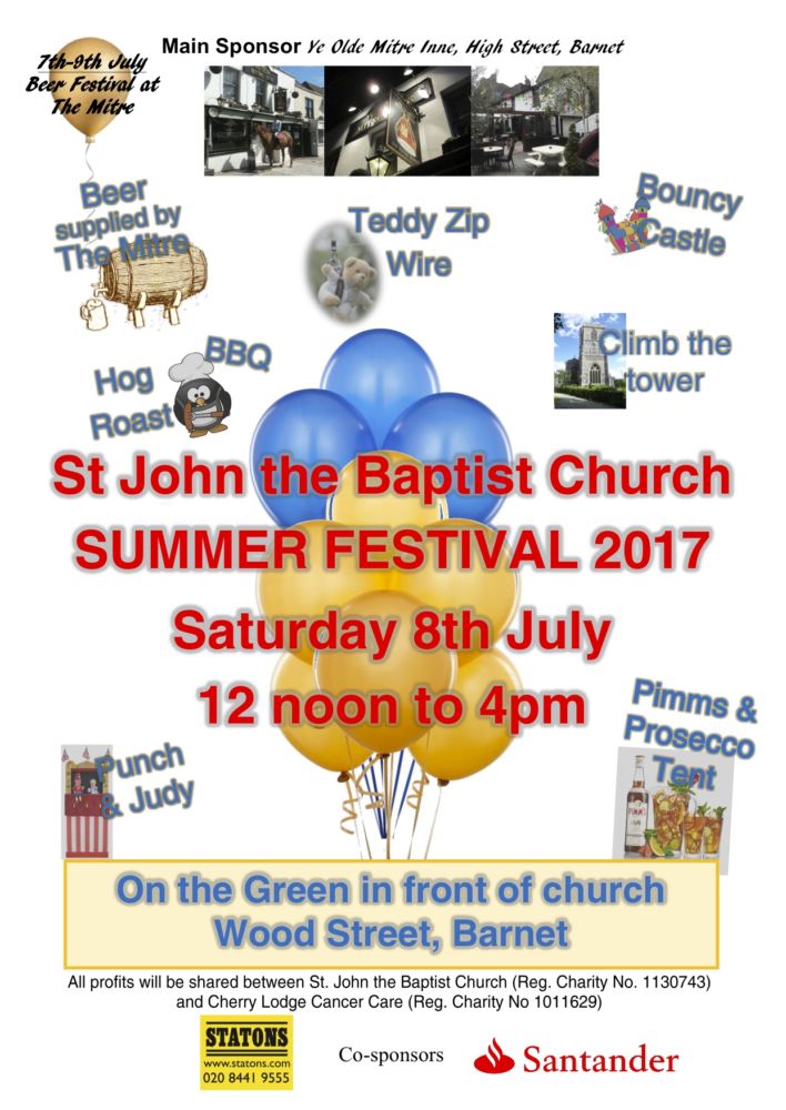 We are very pleased to advertise the Summer Festival of Barnet Parish Church, which will be taking place on Saturday 8th July 2017, from 12 noon to 4pm. All profits will be shared between St John the Baptist Church and Cherry Lodge Cancer Care.