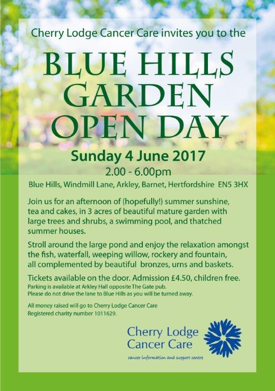 Enjoy a beautiful garden and help us raise money for Cherry Lodge Cancer Care’s many services for local people affected by cancer. The fabulous, 3-acre garden of ‘Blue Hills’ in Windmill Lane, Barnet, EN5 3HX will be open to visitors on Sunday 4th June 2017, from 2 to 6pm.