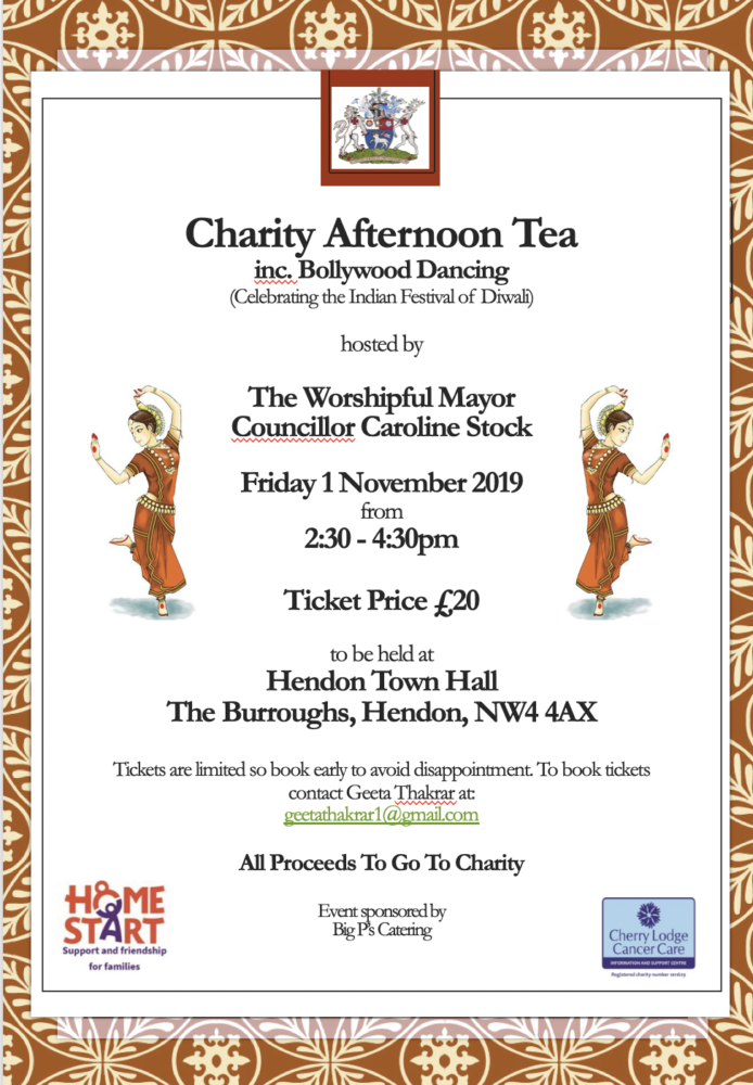 The event will take place on Friday 1st November 2019 at Hendon Town Hall. It will be hosted by The Worshipful Mayor of Barnet, Councillor Caroline Stock. There will be music and Bollywood dancing as well as a delicious tea.