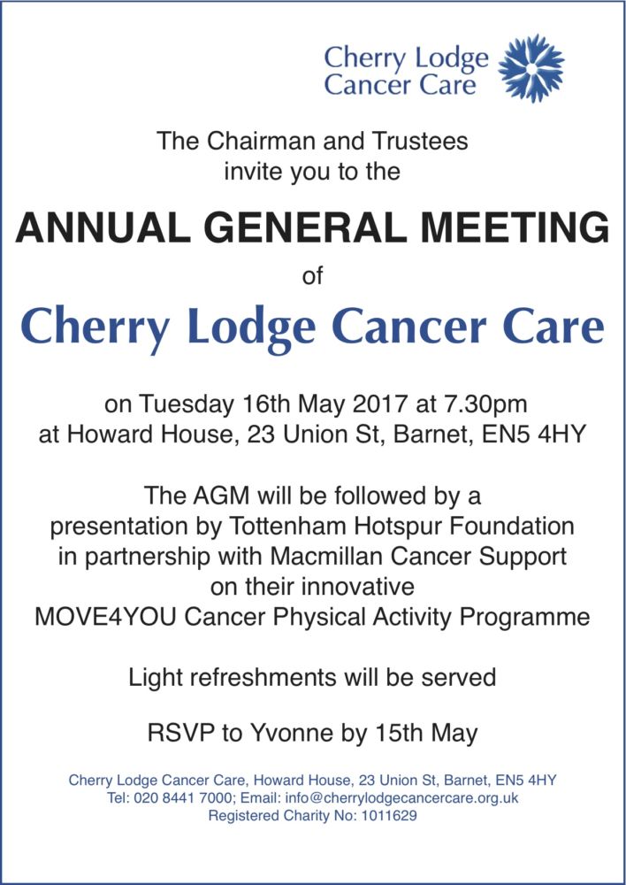 Our Annual General Meeting will be held at the Cherry Lodge Centre, Howard House in Union Street, Barnet on Tuesday 16h May 2017 at 7.30pm. Anyone with an interest in Cherry Lodge and our work is invited to attend.