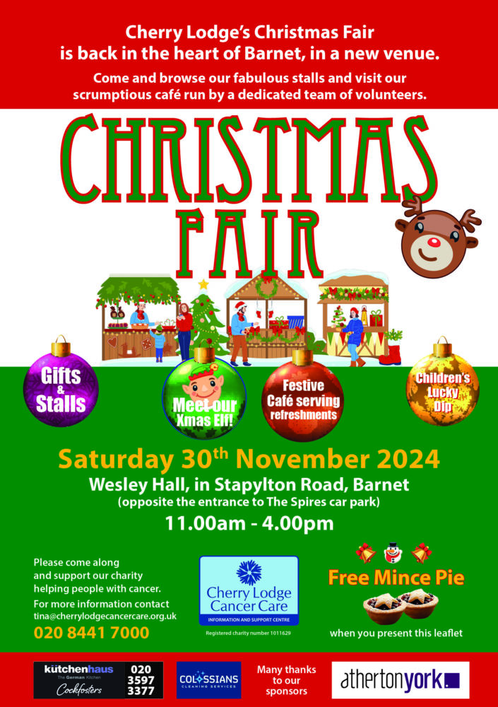 The 2024 Cherry Lodge Cancer Care Christmas Fair will take place on Saturday 30th November, from 11am until 4pm. This year, we have a new venue in the heart of Barnet: Wesley Hall, in Stapylton Road, opposite the entrance to The Spires car park.