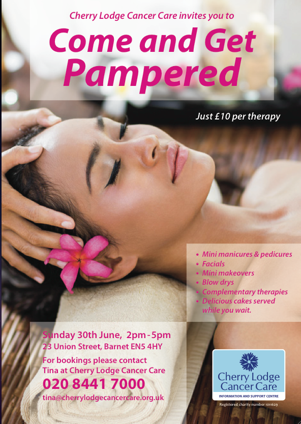 ‘Come and Get Pampered’ at the Cherry Lodge Cancer Care centre on Sunday 30th June 2019, from 2pm to 5pm.