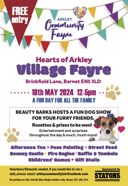 The Cherry Lodge Cancer Care stall will be at the Hearts of Arkley Village Fayre at Brickfield Lane on Saturday 18th May 2024.