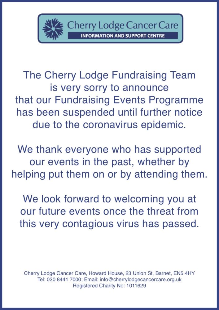 CL Fundraising Events cancelled to end of June March 23, 2020 By Cherry Lodge Cancer Care Calendar When: June 1, 2020 all-day 2020-06-01T00:00:00+01:00 2020-06-02T00:00:00+01:00 Contact: Tina 020 8441 7000 Email Due to the seriousness of the coronavirus epidemic, Cherry Lodge Cancer Care’s programme of events has been cancelled until at least the end of June 2020.