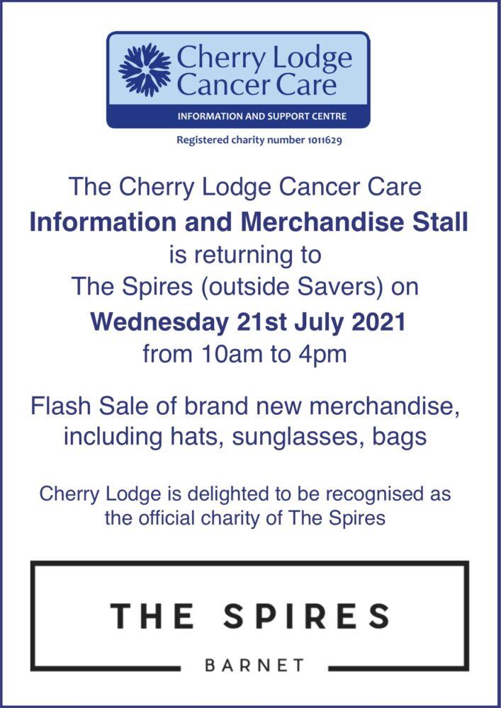 The Cherry Lodge Cancer Care Information and Merchandising stall is returning to Barnet’s The Spires (outside Savers) on Wednesday 21st July 2021.