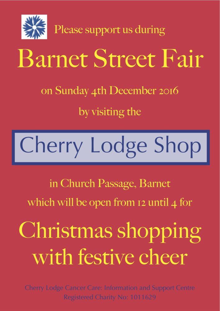The annual Barnet pre-Christmas Street Fair will be taking place on Sunday 4th December 2016 and the Cherry Lodge Shop in Church Passage will be open specially for the afternoon, from 12 noon until 4 pm.