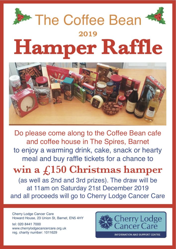 Krimo and Paul of The Coffee Bean cafe and coffeehouse in Barnet’s The Spires Shopping Centre are again raising money for Cherry Lodge Cancer Care by putting together and raffling a fabulous Christmas hamper full of festive goodies.