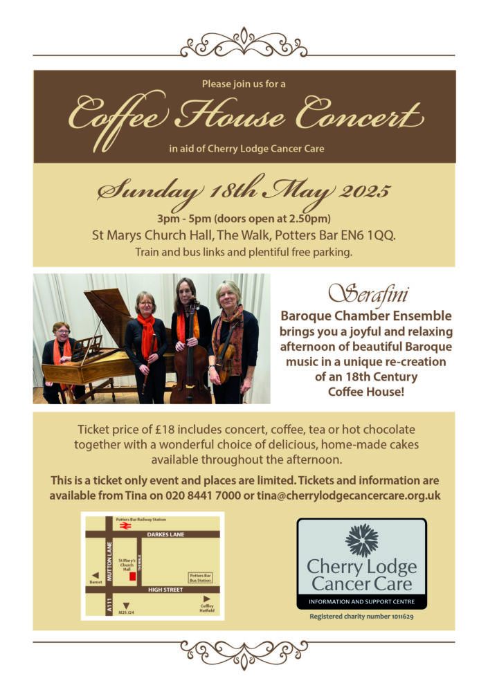 The ticket price of £18 includes concert, coffee, tea or hot chocolate, together with a wonderful choice of delicious home-made cakes available throughout the afternoon.