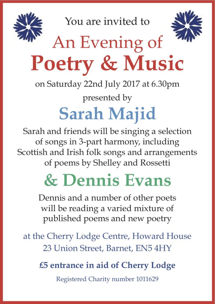 You are invited to an Evening of Poetry and Music, presented by Sarah Majid and Dennis Evans, on Saturday 22nd July 2017, starting at 6.30pm. The event will take place at Howard House and all proceeds will go to help Cherry Lodge Cancer Care continue to provide its many information and support services for people affected by cancer.