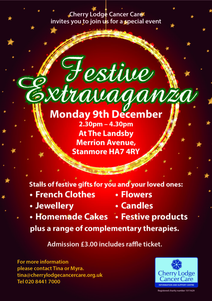 Cherry Lodge Cancer Care invites you to join us for a Festive Extravaganza at The Landsby, Merrion Avenue, Stanmore HA7 4RY on Monday 9th December 2024 from 2.30 to 4.30pm.