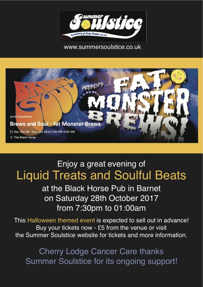 Enjoy a Halloween themed evening of Brews and Soul at Barnet’s Black Horse pub in Wood Street on Saturday 28th October 2017, from 7.30pm until 1am.