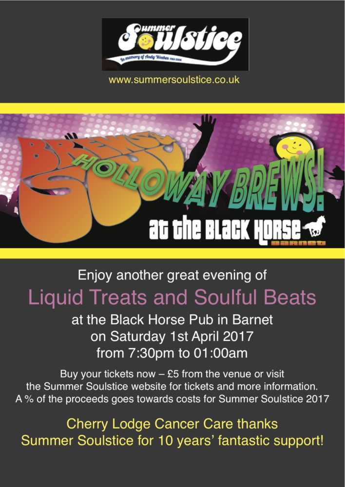 Despite the date, there’ll be no fooling about at Summer Soulstice’s next Brews and Soul event – Holloway Brews – to be held on 1st April 2017, from 7.30pm until 1am at the Black Horse pub in Wood Street, Barnet. DJ Nicky Holloway will be joining residents Double-J and Jester Groove to provide another great evening of soulful beats. As always, the pub’s friendly and hard-working staff will be offering a wide selection of beers along with a great wine list and an ever-changing choice of craft ales.