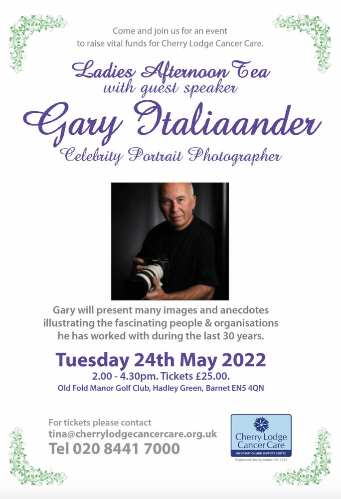 As well as helping Cherry Lodge raise vital funds, you will be treated to a delicious tea and a most entertaining presentation by celebrity photographer Gary. Thirty years’ experience of working with fascinating individuals and organisations has provided Gary with a wealth of outstanding images and interesting anecdotes to share with you.