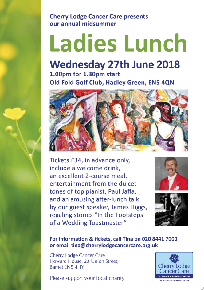 Tickets (in advance only) cost £34 per person and are available from Tina on 020 8441 7000 or email tina@cherrylodgecancercare.org.uk. Drinks will be offered from 1pm with lunch starting at 1.30pm.