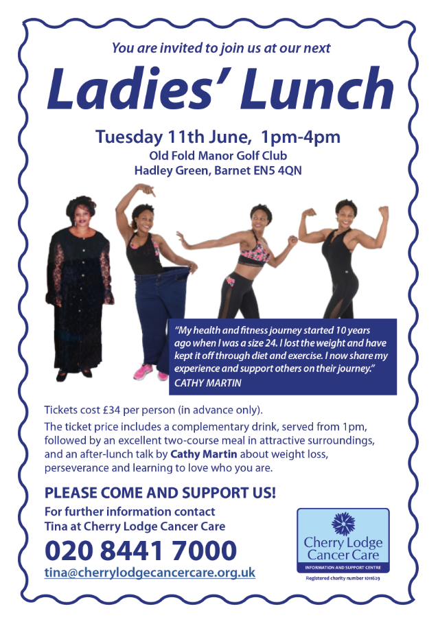 Book your places now for what promises to be a very enjoyable ‘Ladies Lunch’ in aid of Cherry Lodge Cancer Care. Please support Cherry Lodge by coming to this event, which will take place on Tuesday 11th June 2019, from 1pm to 4pm, in the attractive surroundings of Old Fold Manor Golf Club, Hadley Green.