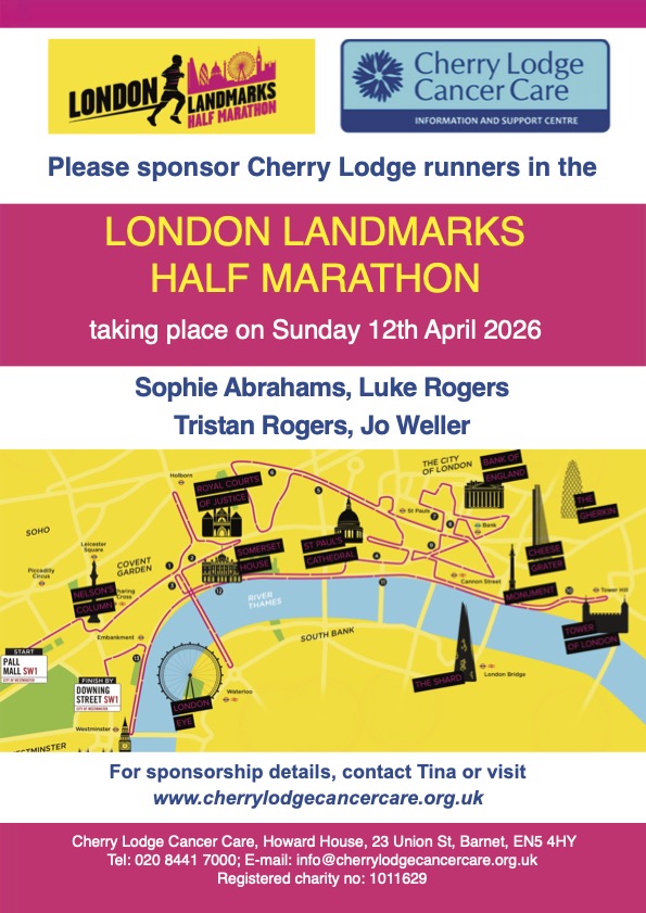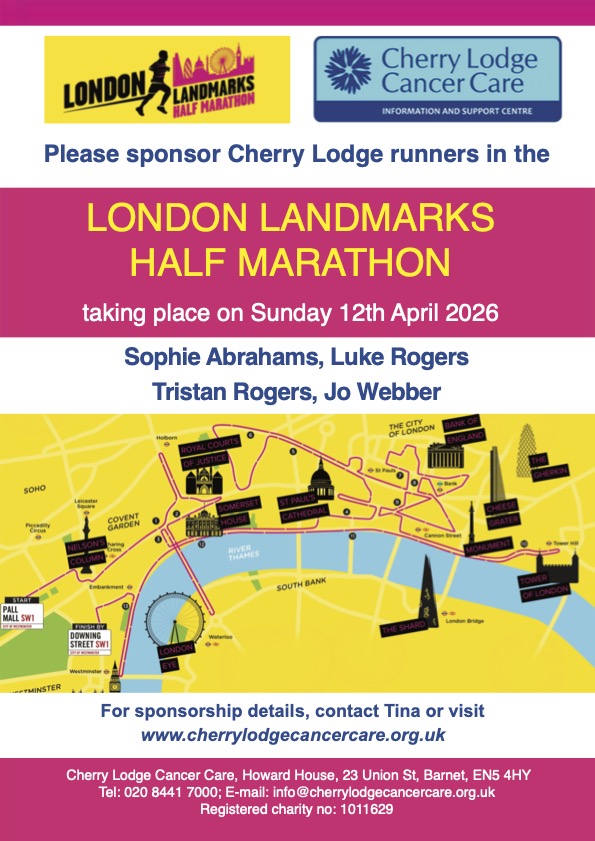 Cherry Lodge Cancer Care has a team of four runners raising money for us by taking part in this great event. The money they raise through sponsorship will help Cherry Lodge continue to provide our much needed cancer information and support services completely free of charge.