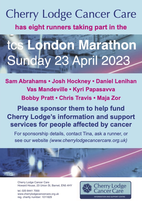 Cherry Lodge Cancer Care has eight runners taking part in this iconic event. The money they raise through sponsorship will make a big difference, helping Cherry Lodge continue to provide much needed cancer information and support services completely free of charge.