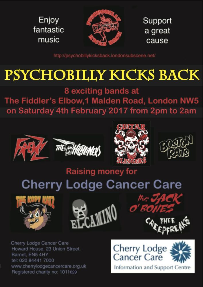 The event will take place on Saturday 4th February 2016 at The Fiddler’s Elbow in Kentish Town, from 2 in the afternoon until 2 in the morning. Music will be provided by eight great Psychobilly bands – Frenzy, The Highliners, Guitar Slingers, Boston Rats, The Kopy Katz, El-Camino, the Jack O’Bones, and Thee Creepfreaks.