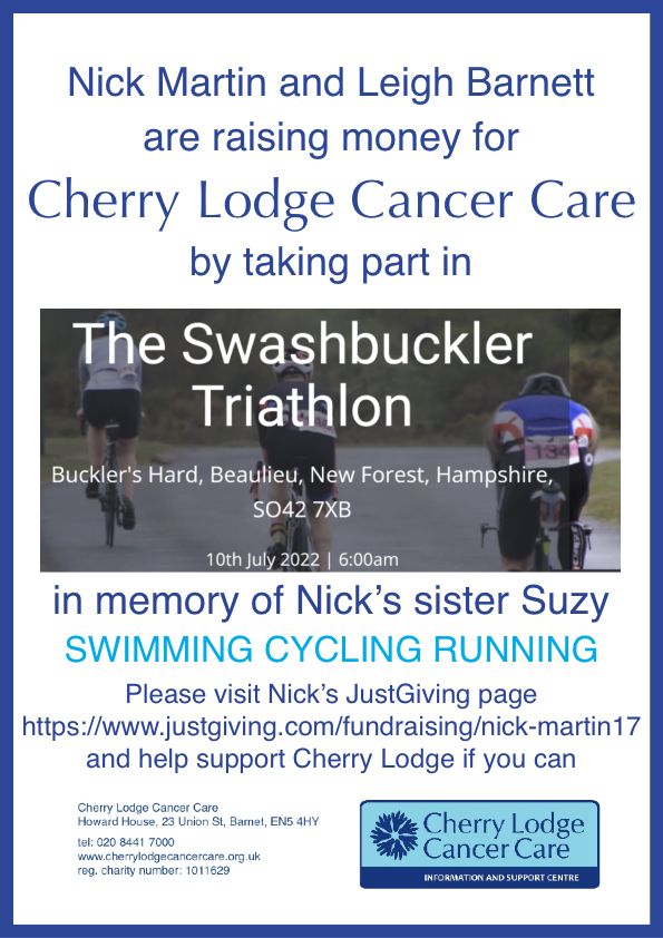 On 10th July 2022, Nick Martin and his friend Leigh Barnett will be taking part in The Swashbuckler Triathlon in the New Forest, raising money for Cherry Lodge Cancer Care in memory of Nick’s sister Suzy Bishop.
